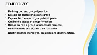 The document discusses group dynamics, defining groups, their characteristics, and theories of group development including the stages of formation. It examines how groups influence members through psychological phenomena like groupthink, and addresses the formation of attitudes, stereotypes, prejudice, and discrimination. Key concepts explored include the definition of groups, their structure, dynamics, and the behavioral aspects relating to attitudes and social categorization.