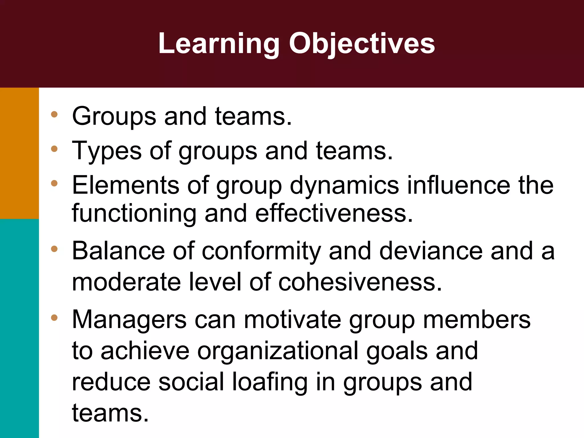 This document discusses groups and teams in organizations. It defines groups and teams, and describes different types of groups like formal vs informal groups and task vs command vs interest groups. It also discusses characteristics that distinguish teams from groups. The document outlines factors that influence group dynamics and effectiveness, such as group size, task interdependence, roles, leadership, stages of group development, norms, conformity/deviance, and cohesiveness. It provides guidance for managers to motivate groups, reduce social loafing, and manage groups for high performance. Various group decision making techniques are also summarized.