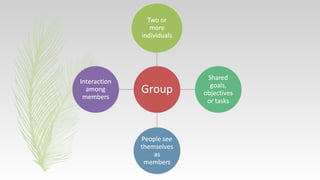Group dynamics refers to the attitudes and behaviors of groups. There are various types of groups that people join for reasons like security, status, and goal achievement. Groups develop through stages according to theories of formation. They have structures including roles, norms, status, size, cohesiveness, and diversity that impact decision making. Techniques like interacting, brainstorming, and nominal groups can be used for effective and unbiased group decisions.