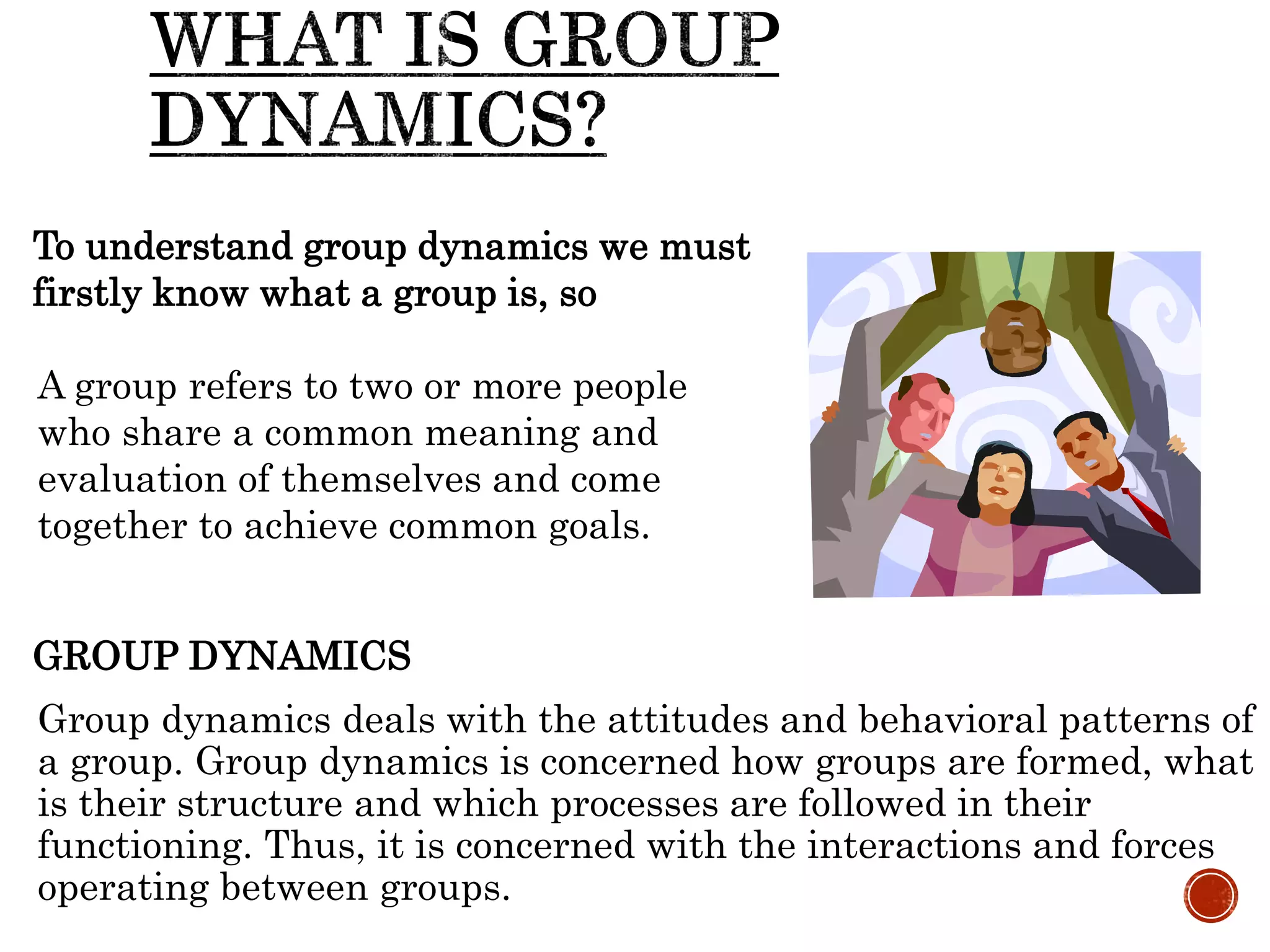 Group dynamics deals with how groups are formed, their structure, and processes. It examines the interactions between group members and forces operating within the group. A group consists of two or more people who share common goals and evaluate themselves as part of the group. Group dynamics ensures members feel a sense of belonging and attraction to the group influences them. It also examines how changes in one part of the group can impact other parts. Team building activities improve communication, develop roles and skills, and foster better relationships and productivity to benefit the group.