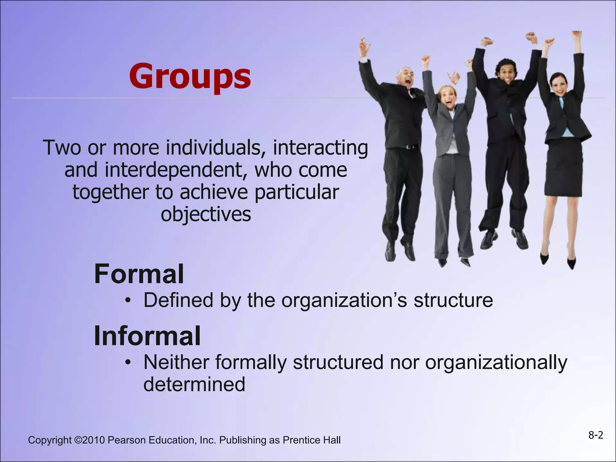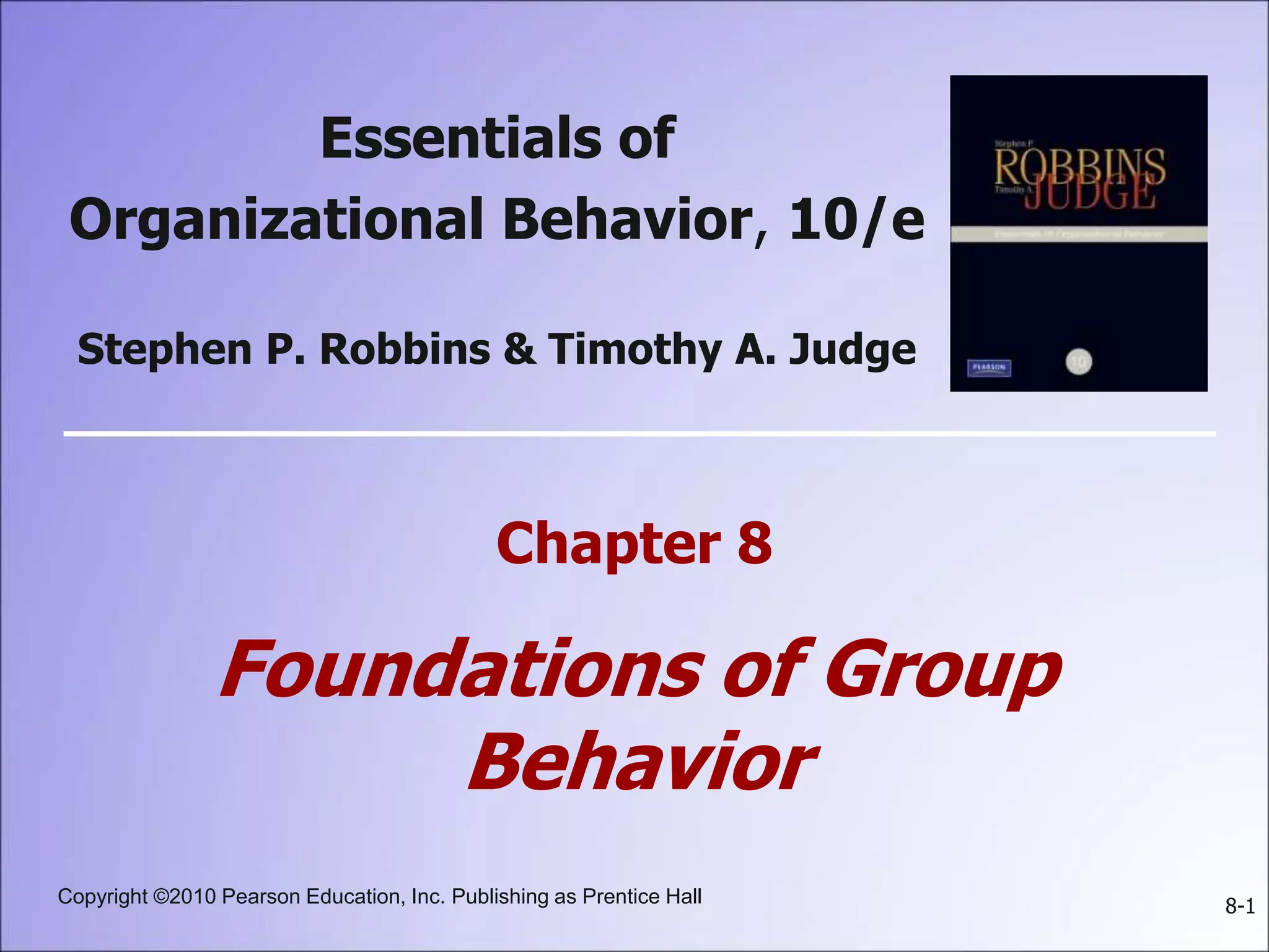 This document summarizes key concepts about groups and group behavior, including: defining groups and their types; the five stages of group development; the five properties of groups including roles, norms, status, size, and cohesiveness; how norms and status influence individual behavior; strengths and weaknesses of group decision-making; and implications for global business and management.