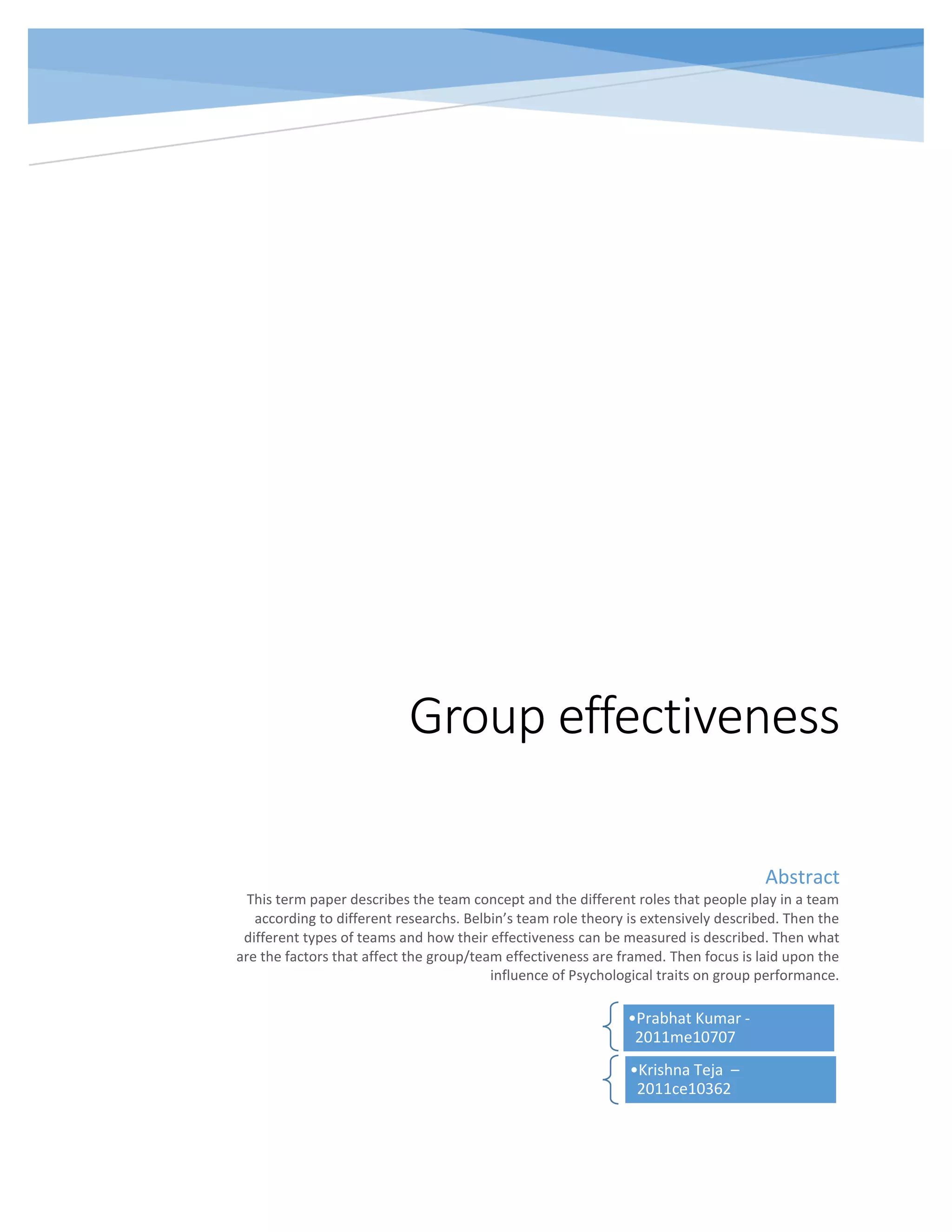 The document discusses various factors that influence team effectiveness, including group psychological traits like cohesion, norms, affects, cognition, certainty, and attribution biases. It examines Belbin's team role theory and describes different types of teams. The conclusion is that cognitive and affective dimensions impact outcomes differently and that factors influencing effectiveness depend on the type of team.