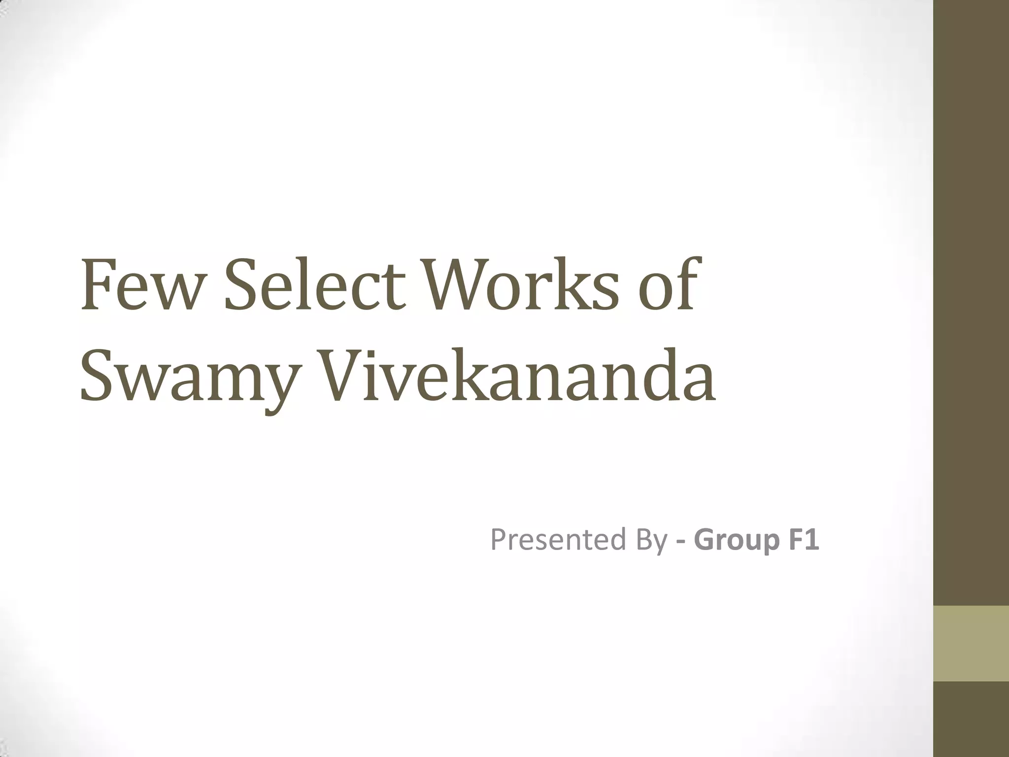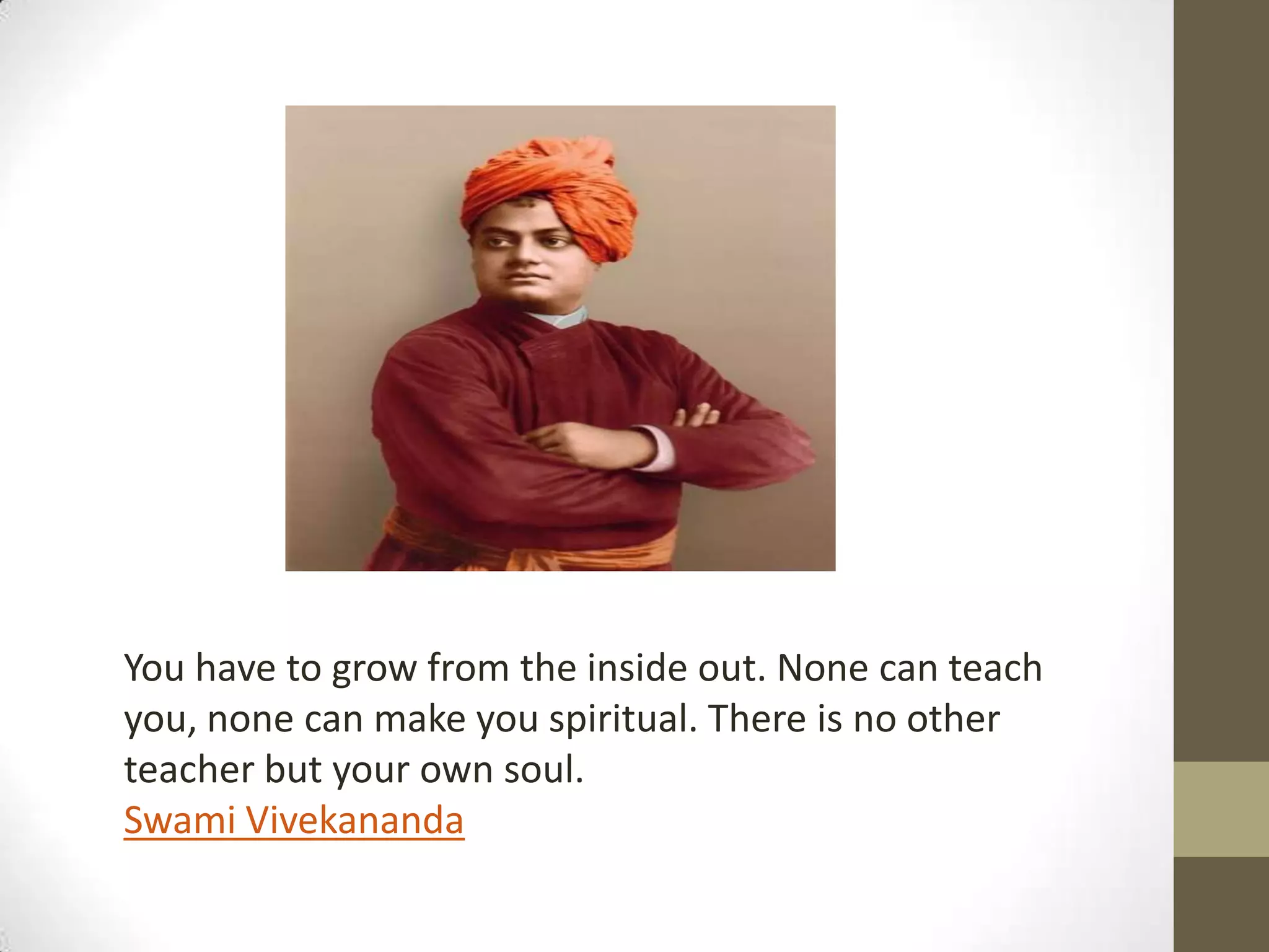 This document contains excerpts from the teachings of Swami Vivekananda on various topics such as concentration and breathing, teamwork and jealousy, leadership values, and intellect versus heart. It provides background on Vivekananda's life and influence, and shares his insights on developing concentration through breathing exercises, overcoming jealousy to enable teamwork, qualities of an effective leader, and the power of heart over intellect.