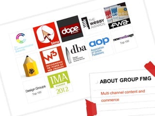 Group FMG is a digital asset production company that was formed through multiple acquisitions and now provides services globally. It offers consulting, content production, and technology solutions for commerce, publishing, packaging, advertising, and other industries. Group FMG has offices in New York, London, and Chennai and serves over 75 global clients through various commercial models.