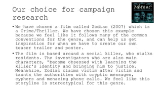 The group chose to research the crime thriller film Zodiac (2007) as their example. Zodiac is about a real serial killer who stalked victims in the 1960s-70s and taunted investigators with cryptic messages. They felt it followed genre conventions well to inspire their own teaser trailer and poster. Their analysis found the teaser trailer used fast editing, closeups, fades, and mysterious text and imagery typical of thrillers. The film poster also used common thriller elements like a night setting, low-key lighting, the characters' faces, and colors of black, red and blue that connote fear, blood and the police investigation.