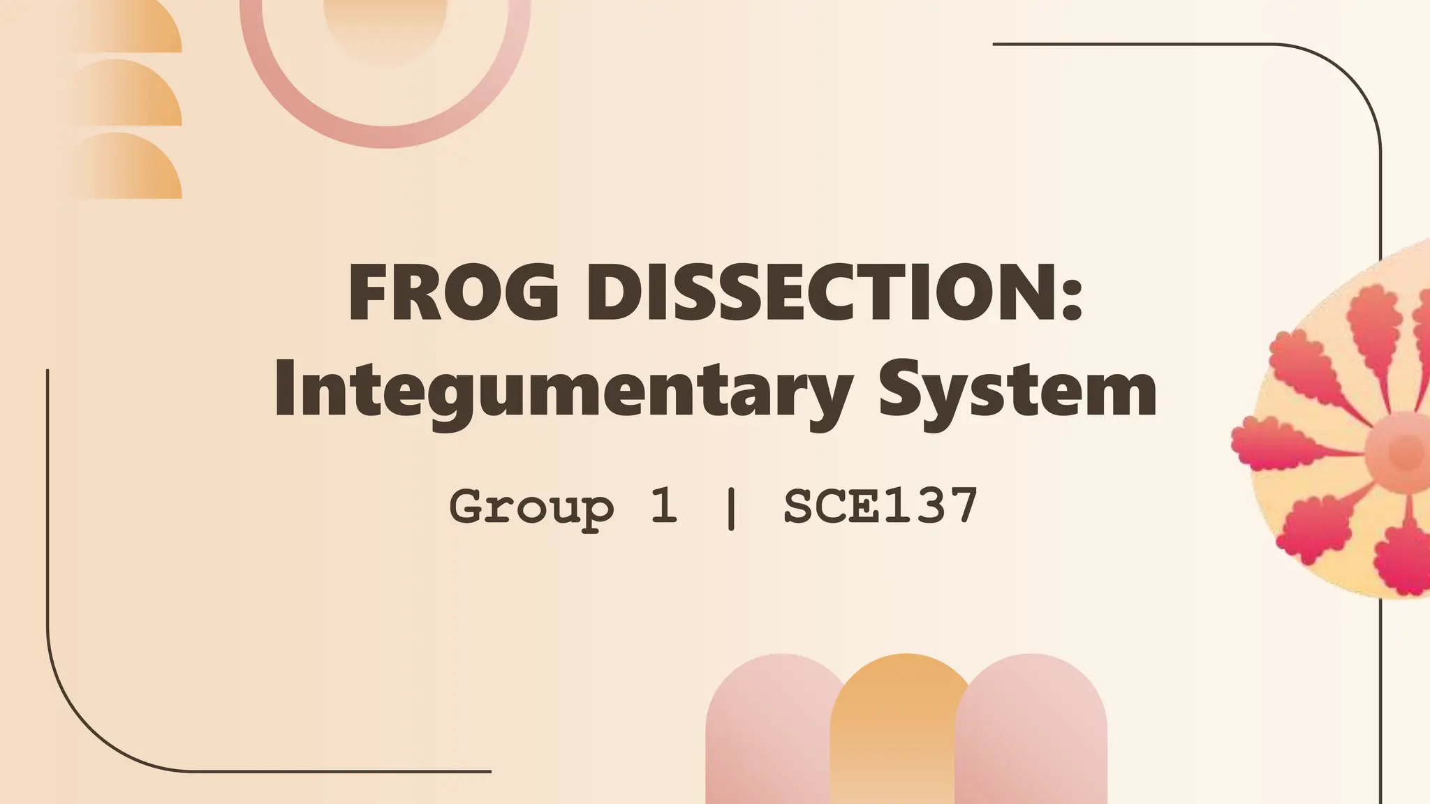 The document summarizes the frog's integumentary system. The frog's skin has light brown and black pigmented bumps that help with camouflage. It has two main layers, an epidermis layer and dermis layer. The epidermis is thin and rough while the dermis is thick and slimy. The skin contains glands that secrete mucus and poisons, helping to protect and moisturize the frog. The integumentary system allows frogs to breathe, drink, and change color for survival in their environment.