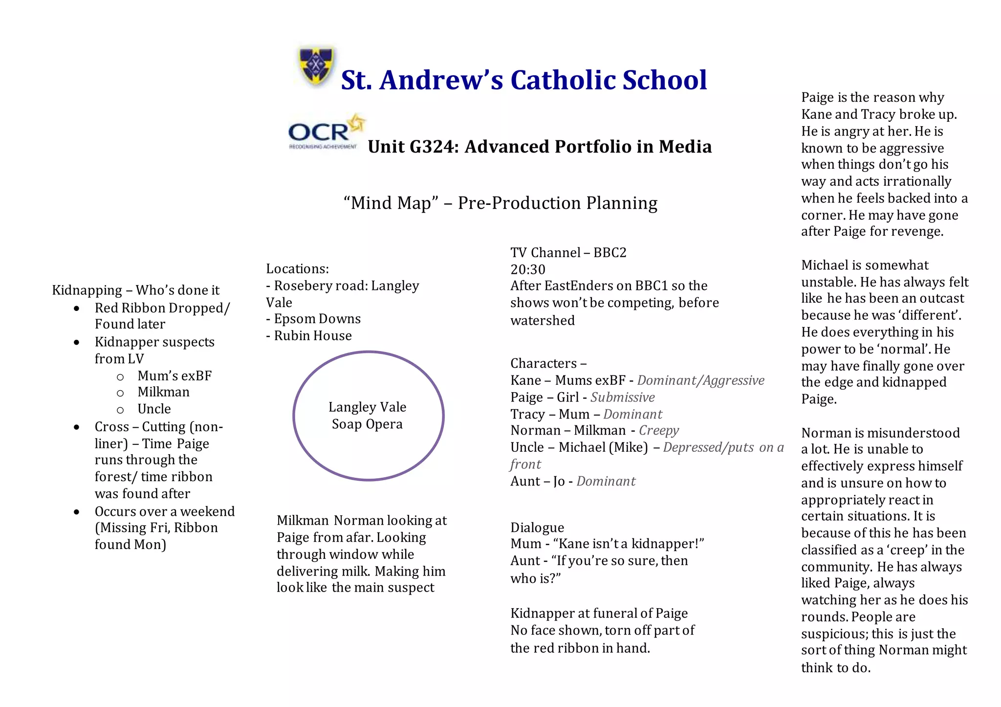 The document outlines a pre-production plan for a soap opera about a kidnapping in the town of Langley Vale. A young girl named Paige goes missing over a weekend and a red ribbon she was wearing is later found. There are three main suspects - Paige's mother's ex-boyfriend Kane, the local milkman Norman, and her Uncle Michael. The show will air on BBC2 at 8:30pm on Mondays after EastEnders to avoid competition. It provides background information on the four main characters and potential locations and dialogue.