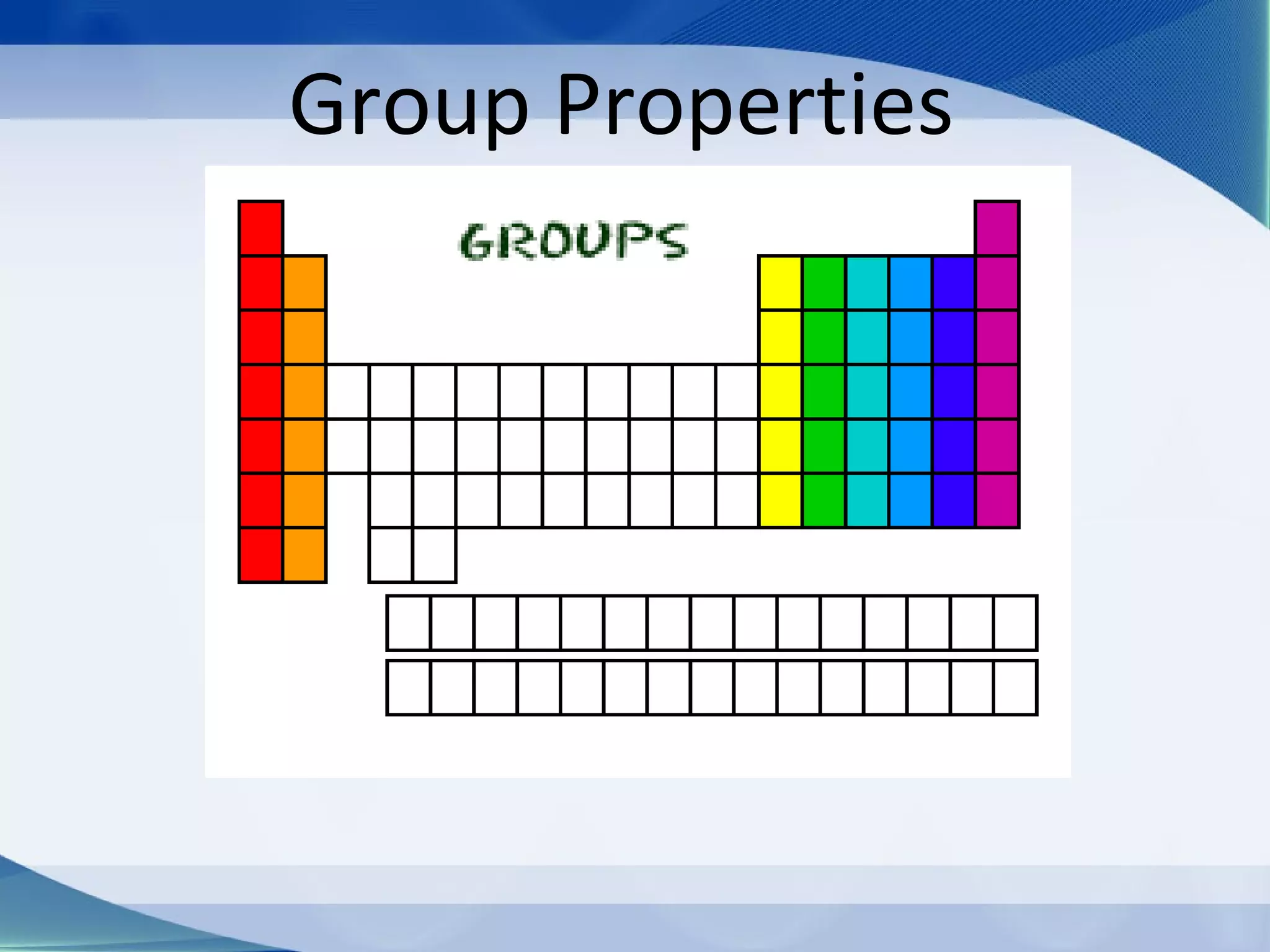 Groups are columns on the periodic table that contain elements with the same number of valence electrons. The document discusses several important groups including hydrogen, alkali metals, alkaline earth metals, transition metals, boron family, carbon family, nitrogen family, oxygen family, halogens, and noble gases. It provides key details about the location of each group on the periodic table and chemical properties common to the elements within each group.