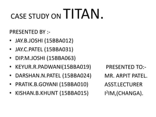 The document provides a case study on Titan Industries, an Indian watch and jewelry company. It discusses Titan's history and diversification into new business segments over time, including watches, jewelry, eyewear, and other products. The case study analyzes Titan's strengths, weaknesses, opportunities, and threats. It also identifies some management issues for Titan, such as strategic planning, managing risk across industries, and the impact of diversification on financial performance. The objectives of the case study are to understand issues related to diversification and developing strategies to manage change within the company.