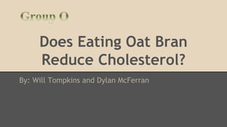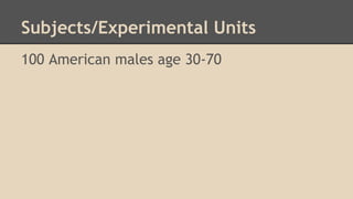This study examines whether eating oat bran reduces cholesterol levels. It involves 100 American males aged 30-70, split into groups of 50 with high cholesterol and 50 with healthy levels. The men are randomly assigned to eat either meals with 3 servings of oat bran per day or meals with 0 servings for two weeks. Their cholesterol is measured after two weeks and two months later after switching diets. The study uses blocking by separating the groups and blinding by not informing subjects about the oat bran to reduce bias in results. A concern is other lifestyle factors may affect cholesterol without the researchers' knowledge.