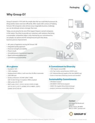 This document summarizes the materials, equipment, and services provided by Group O for packaging and material handling. They offer a broad range of materials from top manufacturers to meet specialty project needs, including various types of wrapping, tape, bags, boxes and other protective packaging. They also provide a wide range of packaging equipment and systems from leading OEMs, and services like preventative maintenance programs, retrofits, and warehouse distribution. Their nationwide service representatives are trained to quickly service and supply parts for client equipment.