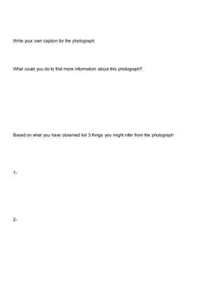 The document describes 6 photographs, providing details about the people and situations depicted in each photo. The first photo shows 4 women cooking together. The second shows Hitler shaking a boy's hand while others smile. The third depicts African Americans with police dogs during a 1960s dog riot. The fourth appears to show a lynched African American man hanging from the Statue of Liberty's arm. The fifth shows a family arriving at Ellis Island to become US citizens. The sixth looks like German officials examining soldiers for war in the 1940s.