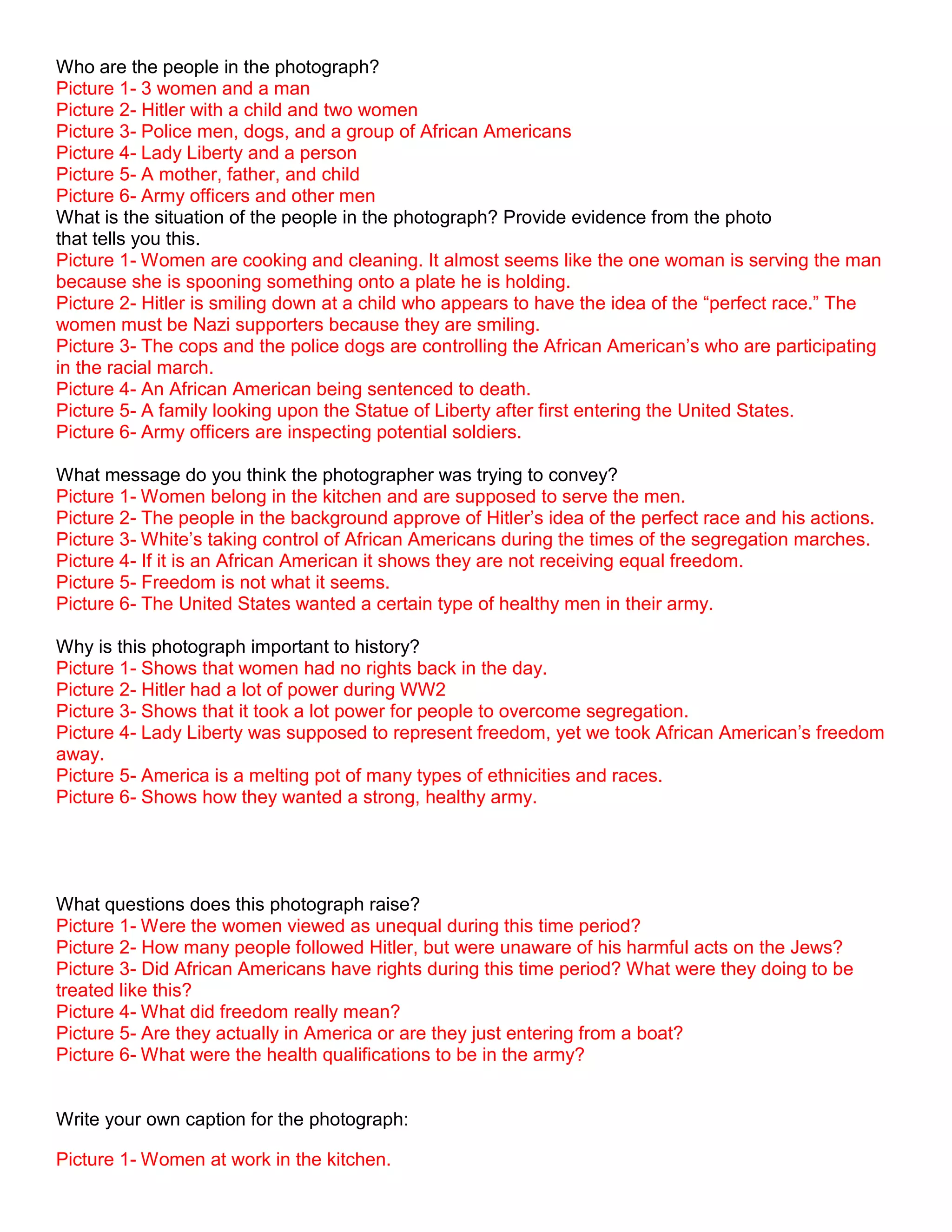 The document discusses 6 historical photographs and asks questions to analyze each one. For picture 1, it infers that it shows women's lack of rights in the kitchen. For picture 2, it infers that Hitler was trying to gain supporters by appealing to children of the perfect race. For picture 3, it infers that African Americans were being attacked and subjected to unnecessary force during segregation marches.