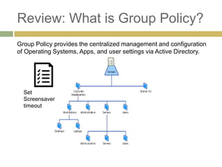 The document provides an overview of Group Policy, its management, and useful tips for configuring settings via Active Directory. It covers various aspects including Group Policy Objects (GPOs), their application order, software restriction policies, and the use of PowerShell for managing GPOs. Additionally, it discusses the importance of Group Policy Preferences and loopback processing for terminal services, emphasizing best practices for security and management.