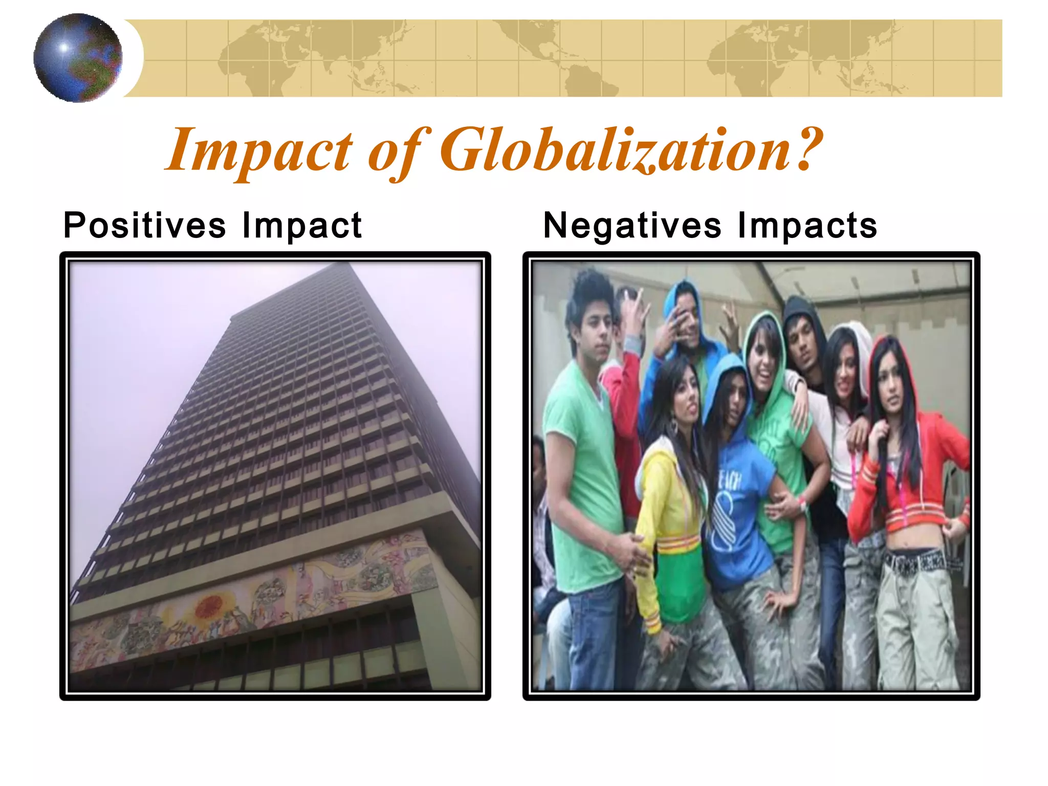 Globalization has both positive and negative impacts. Positively, it increases markets, industry, and economic growth which raises living standards. However, it also threatens local cultures through dominance of global culture. It risks loss of jobs and economic issues. While technology and education are shared, it also increases issues like pollution, wealth disparity, and health problems. Overall, globalization spreads both benefits and challenges across societies in a complex and debated impact.