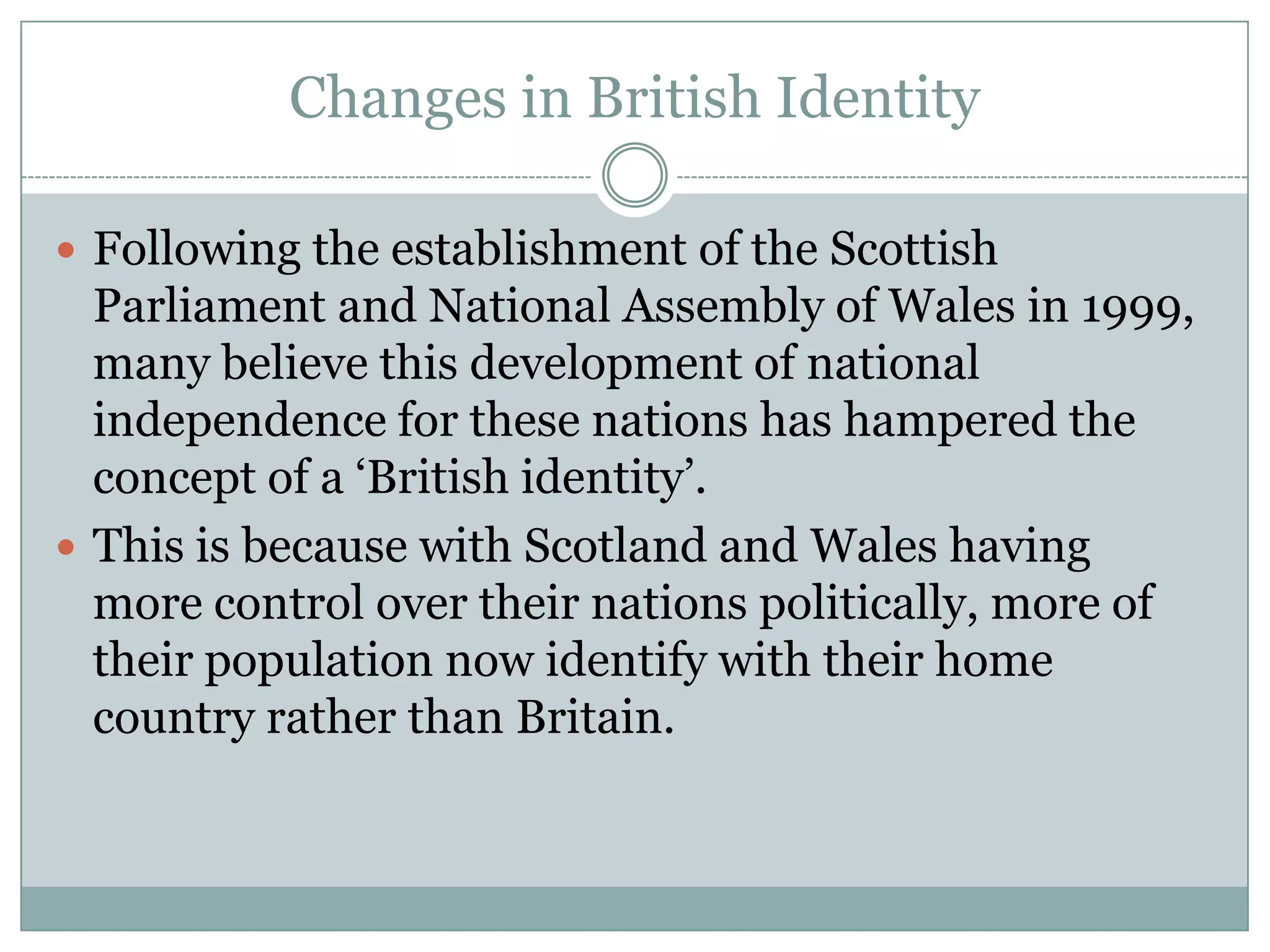 This document discusses research on English and British identity and ethnic diversity in the UK. It finds that with the establishment of devolved governments in Scotland and Wales, more people in those nations now identify with their home country rather than Britain. Being British is seen as a very open identity that includes people of different backgrounds. However, identities can be complex, with people sometimes identifying with both their home nation and Britain. The concept of what it means to be English or British is still evolving.
