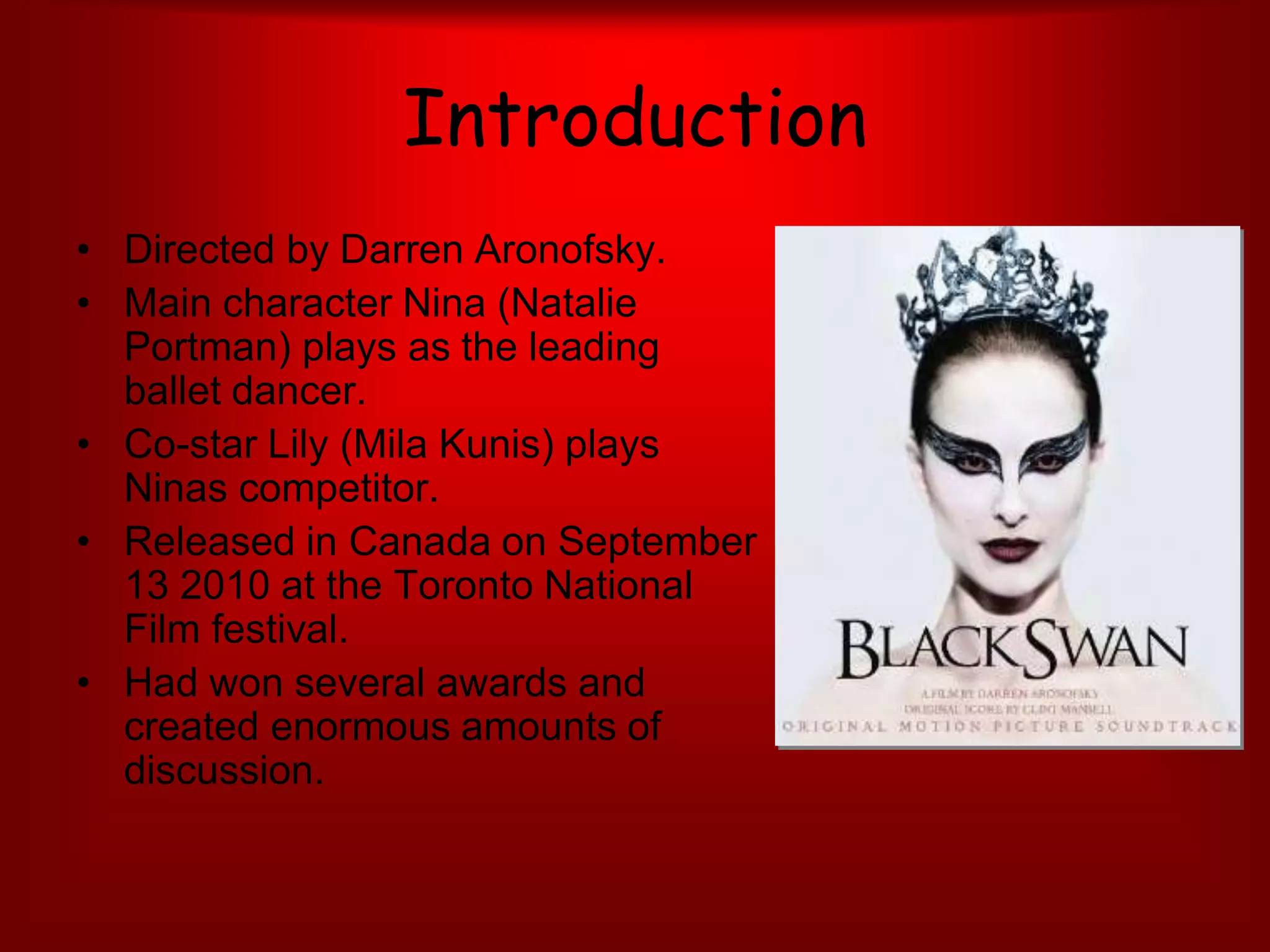 Black Swan is a psychological thriller about Nina, a ballerina in a New York dance company. Nina is chosen to play the lead role of the Swan Queen but struggles with the dark sexuality required for the Black Swan role. Nina begins having hallucinations and losing her grip on reality as the pressures of the role intensify. The film explores Nina's psychological breakdown through her developing anorexia, bulimia, and schizophrenia. It also examines the themes of competition, sexuality, and control through Nina's rivalry with fellow dancer Lily and overbearing relationship with her mother.