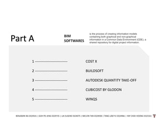 The document discusses several construction estimating software programs, including CostX, Buildsoft, Autodesk Quantity Take-Off, Cubicost by Glodon, and WinQS. For each software, the document provides information on the company, key functions, and potential limitations. It also includes details on the measuring and estimating capabilities of the different programs.