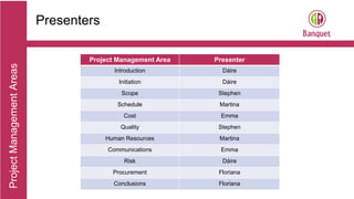 The document outlines the project management plan for a new restaurant takeaway and booking app called Banquet. It discusses the initiation, scope, schedule, cost, quality, human resources, communications, risk, and procurement management plans. The app will initially launch in Dublin with the goal of 10,000 users and 100 restaurants by the end of the first half of 2017. It will allow pre-ordering, home delivery, and online booking through integration with existing reservation software.