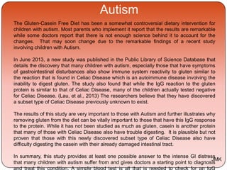 The document discusses a study that found children with autism often have immune system reactivity to gluten similar to celiac disease, even if they test negative for celiac. The study suggests a previously unknown subset of celiac exists. Removing gluten from the diet can be important for those with this immune response. Casein may also be difficult to digest. The study provides insight into gastrointestinal issues in autism and a starting point for diagnosis.