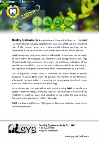 Quality Systemtechnik is a leading water and environmental solutions provider in the Middle East and North Africa established in 2004. It has headquarters in Dubai and warehouses across the region stocked with spare parts to ensure continuous operations for clients. Quality Systemtechnik employs over 50 engineers, chemists and technical professionals to deliver high quality water treatment, purification and chemical products and services under international standards.