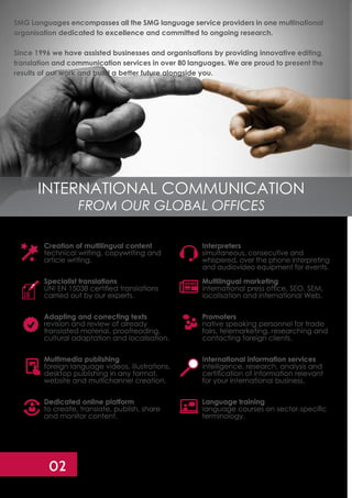 This document provides information about SMG Languages, a multinational group of language service providers operating globally from offices in Berlin, Brescia, Bristol, Lima, New York, and Krakow (opening soon). It offers translation, interpreting, multimedia publishing, and language training services in over 80 languages. The document introduces each office location and its specialized language services. It emphasizes a commitment to research through its Language Research Institute and ensuring quality, data security, and using in-house linguists and sector experts.