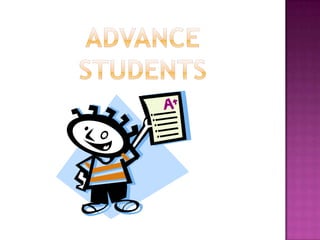 Extroverted students tend to perform better during lessons focusing on remembering and understanding, while introverted students may perform better during applying and analyzing phases of lessons. Younger shy children express shyness through nervousness and fear around new people and situations, while older shy children may feel embarrassment and self-consciousness when the center of attention. Educational programs for intellectually gifted students include enrichment classes, after school programs, and mentorship opportunities to keep them challenged at their level. Recent studies show acceleration does not harm children academically or socially and may increase their enthusiasm for school. Some students have uneven skills across subjects due to conditions like autism or ADHD.