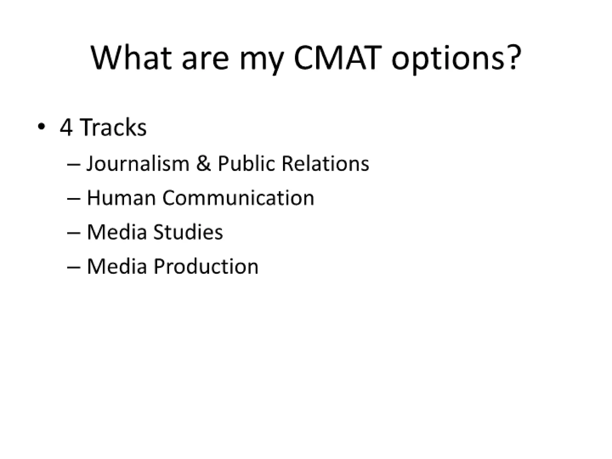 #3 There are 4 tracks within the Communication Arts Major at Salisbury. Each of these tracks offers a wide variety of classes which allows students to fine-tune a general curriculum to their specific needs. Whether you want to be a sports journalist, a political candidate, film-maker or an international mediator there are classes available to provide you with the educational tools you will need to pursue the career you want.