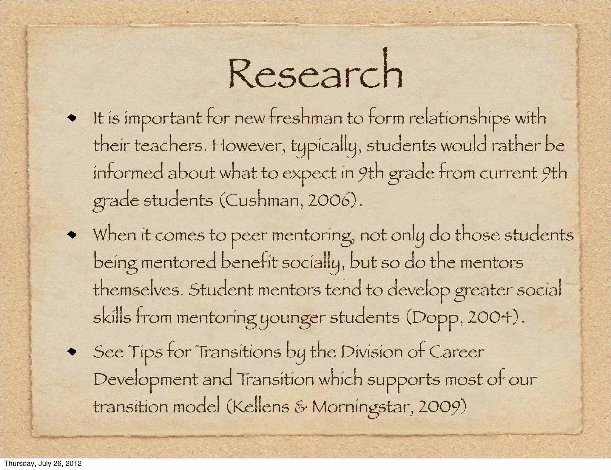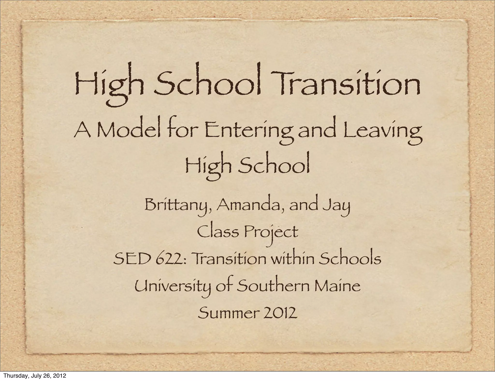 This document summarizes a class project proposing a model for transitioning special education students into and out of high school. The model includes designating a transition coordinator, implementing peer mentoring, holding informational meetings for incoming 9th graders and their guardians, developing career plans and IEP transition plans, and providing support for students pursuing college, vocational training, or dropping out. The proposal recommends tailoring additional models for students with higher needs or transferring schools.