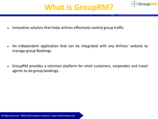 The document describes Grouprm, an innovative application designed to help airlines manage group bookings efficiently through a web-based platform, allowing various stakeholders like retail customers, travel agents, and corporations to submit group requests. It highlights features such as automated fare quoting, tracking of group requests, and ancillary revenue options for airlines, enhancing both productivity and policy enforcement. Additionally, a case study reveals significant improvements in group booking management for a client after implementing Grouprm, showcasing its successful integration and usage in the airline industry.