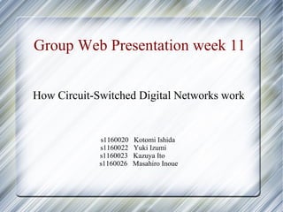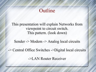 This presentation discusses how circuit-switched digital networks work. It explains that a sender uses a modem to connect to analog local circuits, which then connect to central office switches and digital local circuits. The central office switches work together to route and complete calls through circuit switching. The digital access equipment attached to routers calls the central office switch to initiate a connection, and the central office switch then digitally connects to the destination router and LAN.