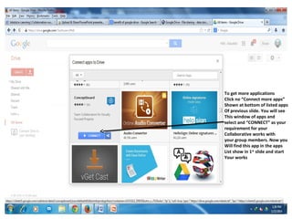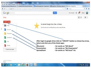 After logging into Google Drive and clicking "CREATE", you can select an app like Document, Presentation, or Spreadsheet to create a file. You can connect more apps by clicking "Connect more apps" at the bottom of the app list. This will allow you to see additional apps and select them. Once an app is selected, you can create a new file and give it a name without needing to manually save. You can then share the file by changing the share settings, inviting group members, and clicking "Share & save".