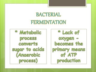 Lactic acid fermentation and mixed-acid fermentation are two types of fermentation processes. Lactic acid fermentation involves the conversion of glucose into lactic acid and cellular energy by lactic acid bacteria like Streptococcus. Mixed-acid fermentation is carried out by bacteria like E. coli and produces three different acids - acetic, lactic and succinic acids. Fermentation processes are important in food preservation and enhancing safety and flavor through the production of acids or alcohol during the breakdown of materials like milk, vegetables, barley and crops.