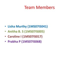 This document discusses various types of proxy servers including anonymous proxy servers, HTTP proxy servers, FTP proxy servers, caching proxy servers, content filtering proxy servers, reverse proxy servers, and ICAP servers. It provides details on their functions and purposes. Team members on the Awesum4sum project are listed and an index outlines topics covered which include introduction to proxy servers, advantages and disadvantages, and a demonstration on CC Proxy.