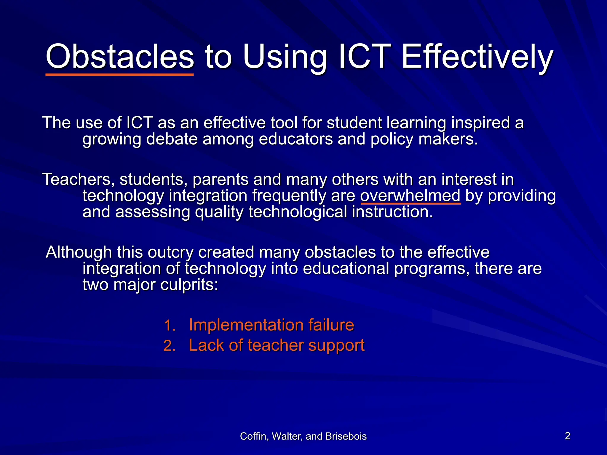 The presentation discusses the obstacles to the effective integration of Information and Communication Technology (ICT) in education, highlighting implementation failures and a lack of teacher support as major challenges. It emphasizes the importance of a shared vision, clear goals, adequate resources, and continuous training for teachers to successfully incorporate technology into the curriculum. The document also reflects on the evolving role of teachers in a technology-driven environment, from traditional instruction to a more collaborative, facilitator-based approach.