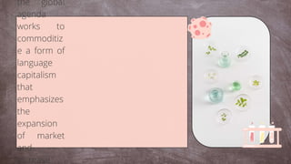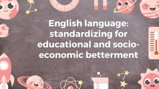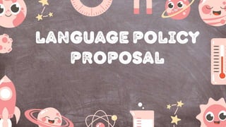 The document proposes a standardized English language policy for educational and socio-economic betterment. It discusses justifying the critical role of English in accessing knowledge and technology. The objectives are to develop language competence, critical thinking, and cultural awareness. It outlines curriculum development, teacher training, infrastructure improvements, and budget considerations. Regular monitoring and evaluation of stakeholders is key to ensuring the policy's inclusive implementation and flexibility over time.