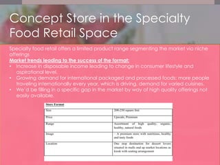 This document provides information on a proposed concept store for specialty food retail. It discusses market trends driving the success of niche food formats, including increasing incomes, demand for international foods, and filling a gap in the market. It then outlines the concept of frozen yogurt parlors being new in Chennai and lists the key existing players. Finally, it proposes positioning the store as providing the finest, freshest yogurt, cupcakes, and cheesecakes made with high quality ingredients with an emphasis on customer happiness.