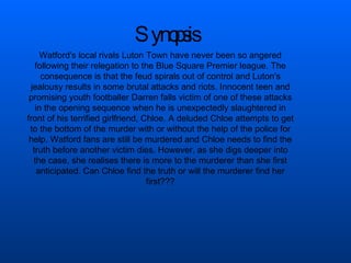 This document proposes a teen horror film called "The Deadly Strike" about a rivalry between football clubs Luton Town and Watford that turns deadly. The synopsis describes how a promising youth player is murdered, leading his girlfriend Chloe to investigate. As she digs deeper, she realizes the murderer is more complex than initially thought. The document discusses researching similar films, targeting teenagers as the audience, setting a £5 million budget, publicity plans including premiering at a film festival, and identifying locations, costumes, music and crew for the production.