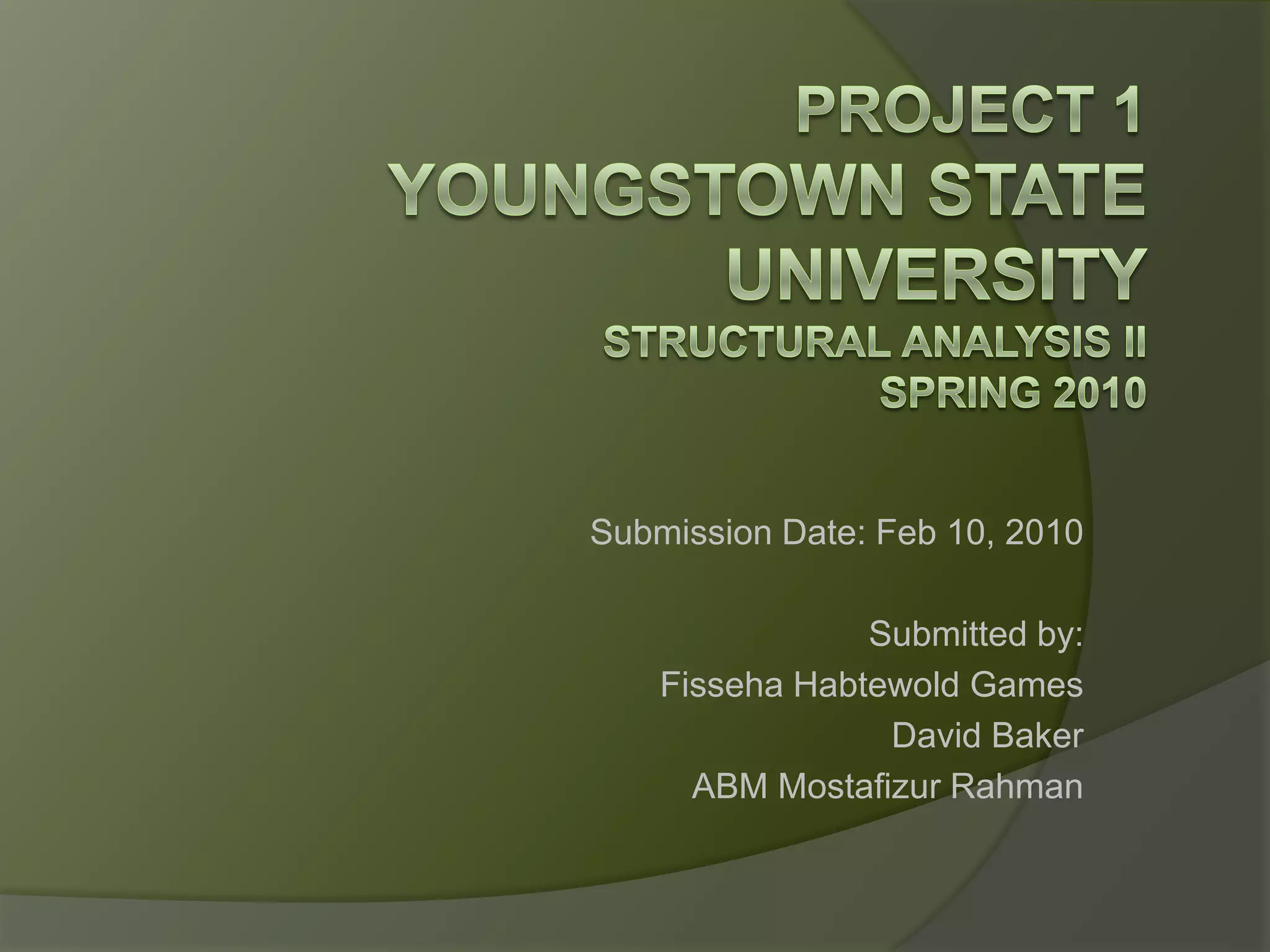 This document is a project submission from three students at Youngstown State University for their Structural Analysis II class in spring 2010. It includes photos of 20 famous structures from around the world such as the Pantheon, Eiffel Tower, Taj Mahal, and Burj Khalifa along with brief descriptions of their locations. It concludes with a photo of a campus building at Youngstown State University.