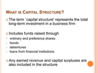 This document assesses the capital structure of Hutchison Whampoa based on its future financing needs. It analyzes Hutchison Whampoa's current capital structure ratios and compares them to industry averages. It also models how different ratios would be impacted by raising $500 million through various combinations of debt and equity. Overall, the analysis finds that Hutchison Whampoa's current capital structure ratios are healthy but could be optimized further to improve profitability and cash flow while maintaining financial stability.