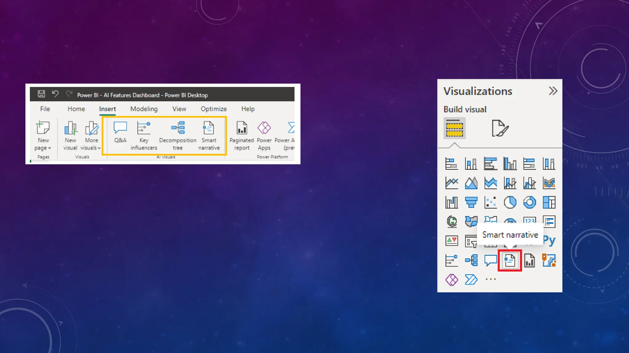 • Smart narrative is a feature in Microsoft power bi that uses artificial intelligence to create summaries of