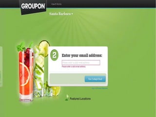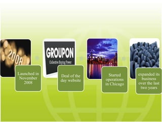 Groupon's business model involves offering daily deals or "groupons" for goods and services provided by local businesses. Merchants pay Groupon a commission (around 50%) for promoting their deals to Groupon's email subscribers. This provides marketing benefits to merchants without upfront costs. While it generates buzz and discounts for customers, critics argue it relies on short-term price sensitivity rather than building long-term customer loyalty. Groupon faces competition from other daily deal sites that may adapt the group buying model in different ways such as localized sales teams.