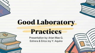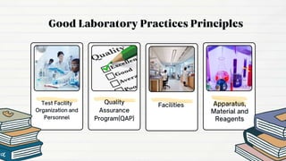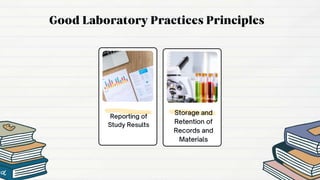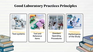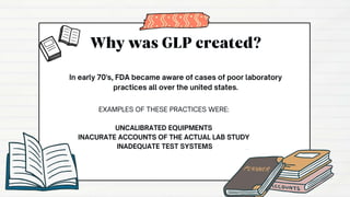 The document discusses the importance of following Good Laboratory Practices (GLP). GLP helps obtain quality and reliable experimental data while minimizing hazardous waste. GLP ensures crucial standards for modern laboratory operations and has become essential for professional scientists to adhere to.