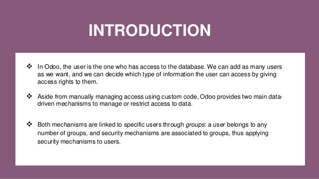 The document discusses user access management in Odoo 15, highlighting how users can be assigned to various security groups to restrict or allow access to specific data. It explains the role of security groups in defining user permissions and the process for creating and managing these groups and their associated access rights. Additionally, it provides guidance on configuring security settings and directing users to resources for further information.