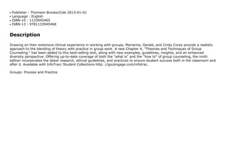 This document provides a summary of the book "Groups: Process and Practice" by Marianne Schneider Corey. The book draws on the authors' clinical experience in group work to blend theory and practice. It offers coverage of both concepts and techniques in group counseling. The ninth edition incorporates current research, ethics, and practices to prepare students for both classroom and professional settings. The book contains 449 pages and was published in 2013 by Thomson Brooks/Cole.