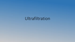 This document summarizes an experiment on ultrafiltration and gel electrophoresis. For ultrafiltration, the goals were to understand membrane separation principles and parameters like osmotic pressure and fouling. Experiments tested filtration rate with different protein concentrations. Results showed osmotic pressure had a greater effect on mass transfer than fouling. For gel electrophoresis, the goals were to separate and measure molecular weights of pepsin and rennet using SDS-PAGE. Results showed crude pepsin, pure pepsin, and rennet-pepsin mixture were close to literature values, while rennet alone had some unexpected bands possibly from breakdown.