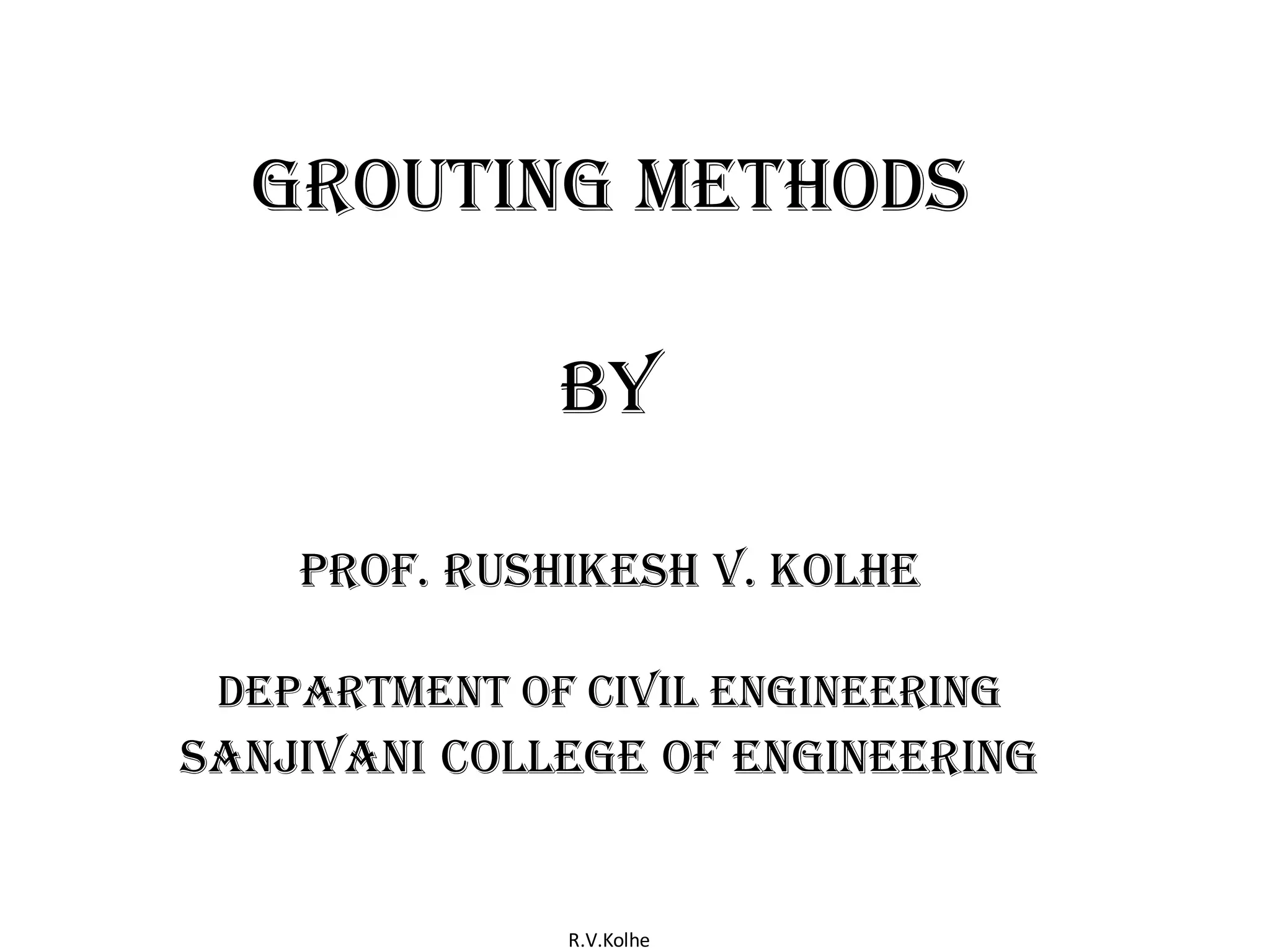 This document discusses different grouting methods. It describes permeation grouting where grout is injected to fill voids without disturbing soil grains. Displacement grouting displaces soil grains, including compaction grouting using thick grout to form bulb shapes, and soil fracture grouting using lean grout to form root-like lenses. Jet grouting forms grouted columns by partly replacing and mixing with soil. Permeation grouting is used to form seepage barriers and stabilize tunnels. Displacement-compaction grouting involves high pressure injection of a soil-cement grout mixture to form 0.5-1m bulbous intrusions.