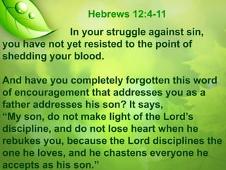 The document discusses the concept of growing through discipline as outlined in Hebrews 12:4-11, emphasizing that God's discipline is intended for our good and fosters spiritual growth. It encourages individuals to understand the value of discipline, repent from sin, be open to learning, and walk in love. The teachings highlight the importance of perseverance in trials to achieve maturity and righteousness.