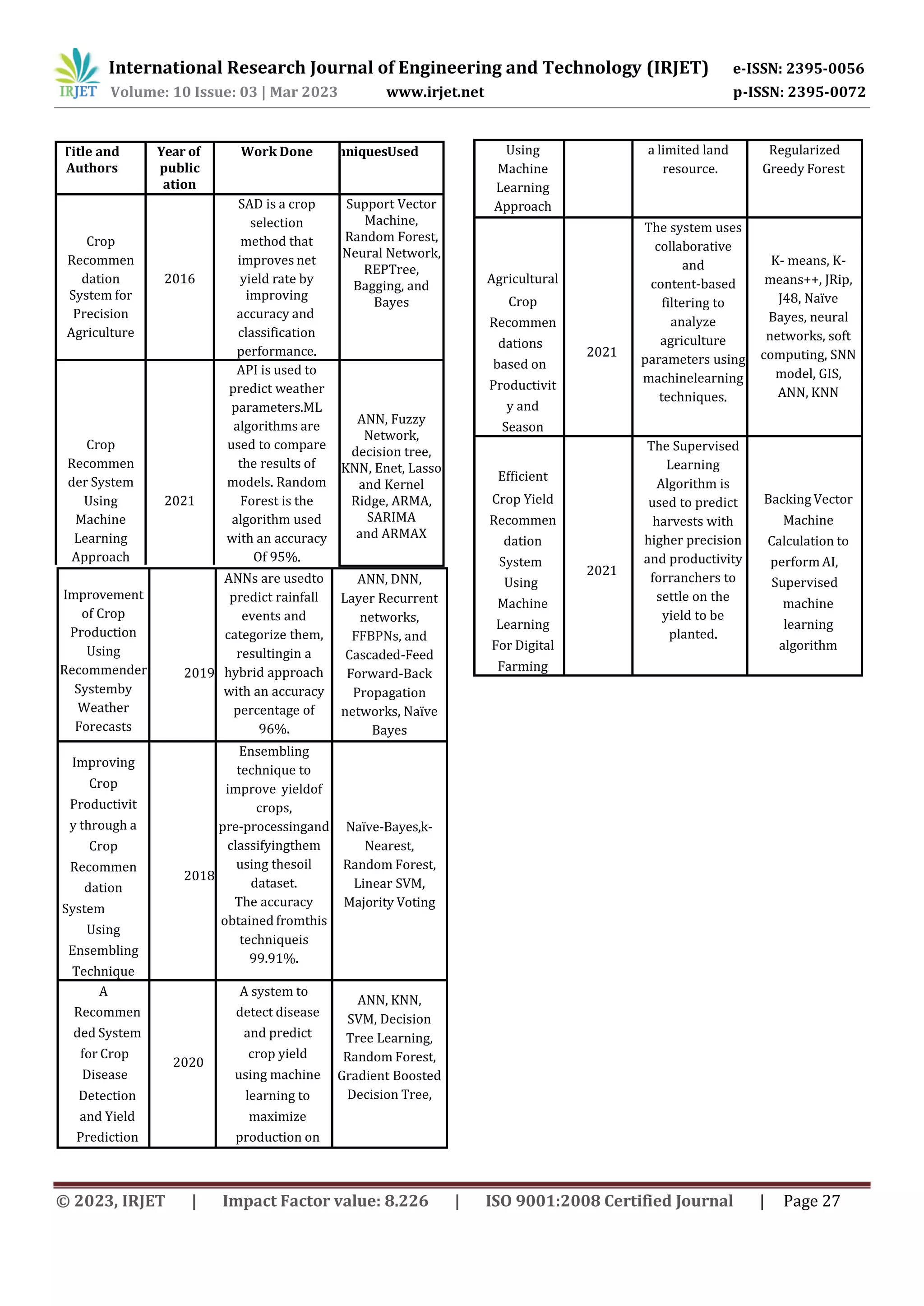 The document describes a proposed system called GrowFarm that uses machine learning to predict crops, fertilizers, and plant diseases. It aims to help farmers select optimal crops and fertilizers for their soil conditions, as well as identify diseases in plants. The system would take soil data and photos of plant leaves as input and provide recommendations. It reviews literature on existing crop recommendation systems that use techniques like decision trees, random forests, neural networks and ensemble methods. The proposed system architecture involves collecting soil parameters, recommending crops/fertilizers using machine learning models, and identifying diseases from plant photos using a deep learning model. It outlines the methodology as loading and pre-processing the dataset, then using it to train models for crop/fer