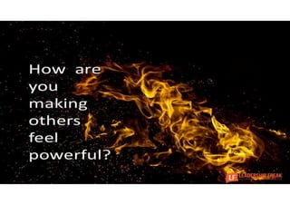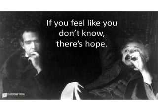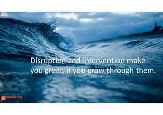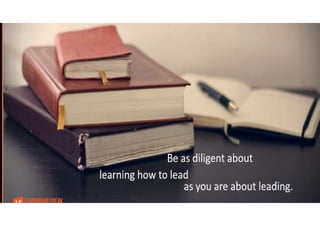 This document provides guidance and questions for leaders to reflect on and improve their leadership. It discusses the importance of self-awareness, seeking feedback, learning from failures and disruptions, releasing anchors like perfectionism, and focusing outward on developing others. Leaders are encouraged to challenge themselves, evaluate their performance critically, and make progress through small actions. Regular reflection on questions like what employees experience working for the leader can help identify areas for growth. Overall it emphasizes that leadership development requires ongoing learning, humility, and courage to acknowledge shortcomings.